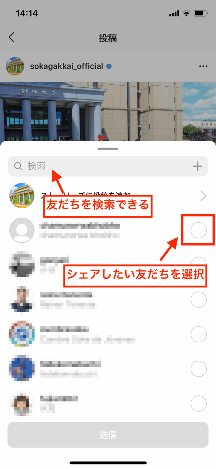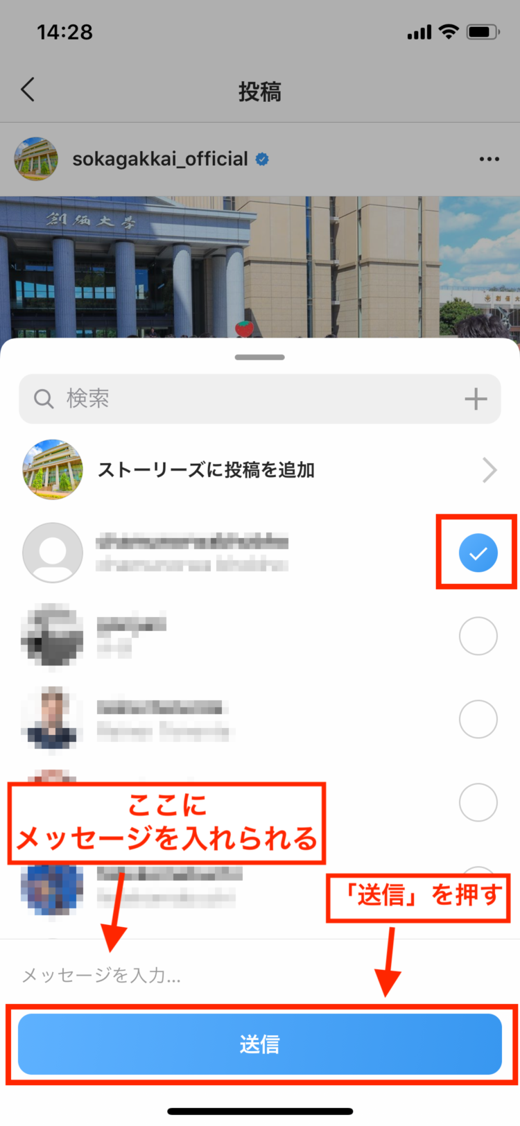 シェアしたい投稿画面で「いいね!」の上に表示されている「紙飛行機マーク(ダイレクトメッセージ)」を押します。 メッセージ欄を書き込み、検索窓にシェアしたい友人の名前を入力します。 「フォローする」のボタンを押せば完了です。
